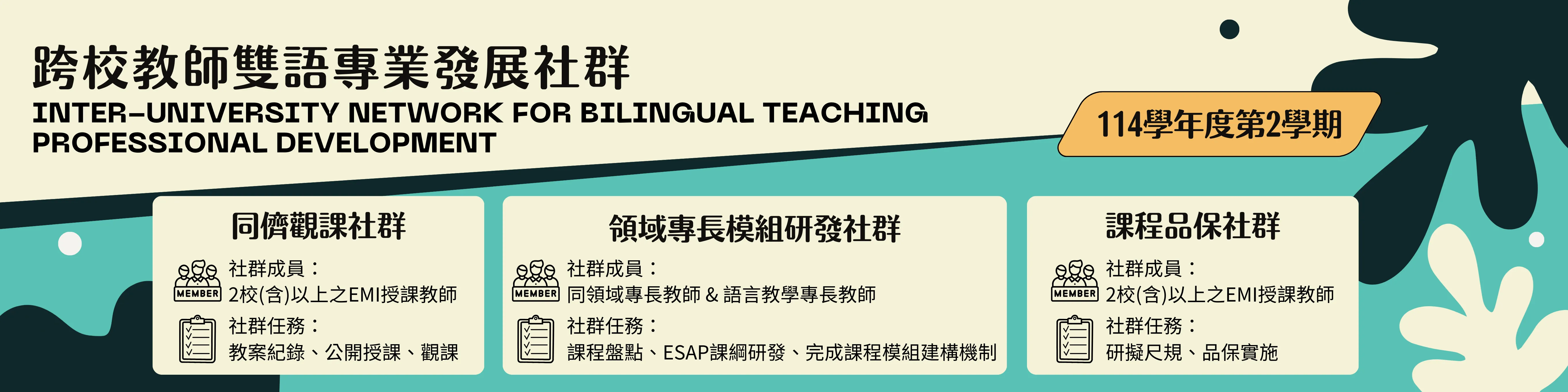 鼓勵全國大專校院教師透過組成專業發展社群,進行課程模組研發、同儕觀課與回饋,並建立課程品保機制,期以任務參與為導向,推動教師間共同協作,持續精進雙語教學專業能力,進而提升EMI課程之教學品質。